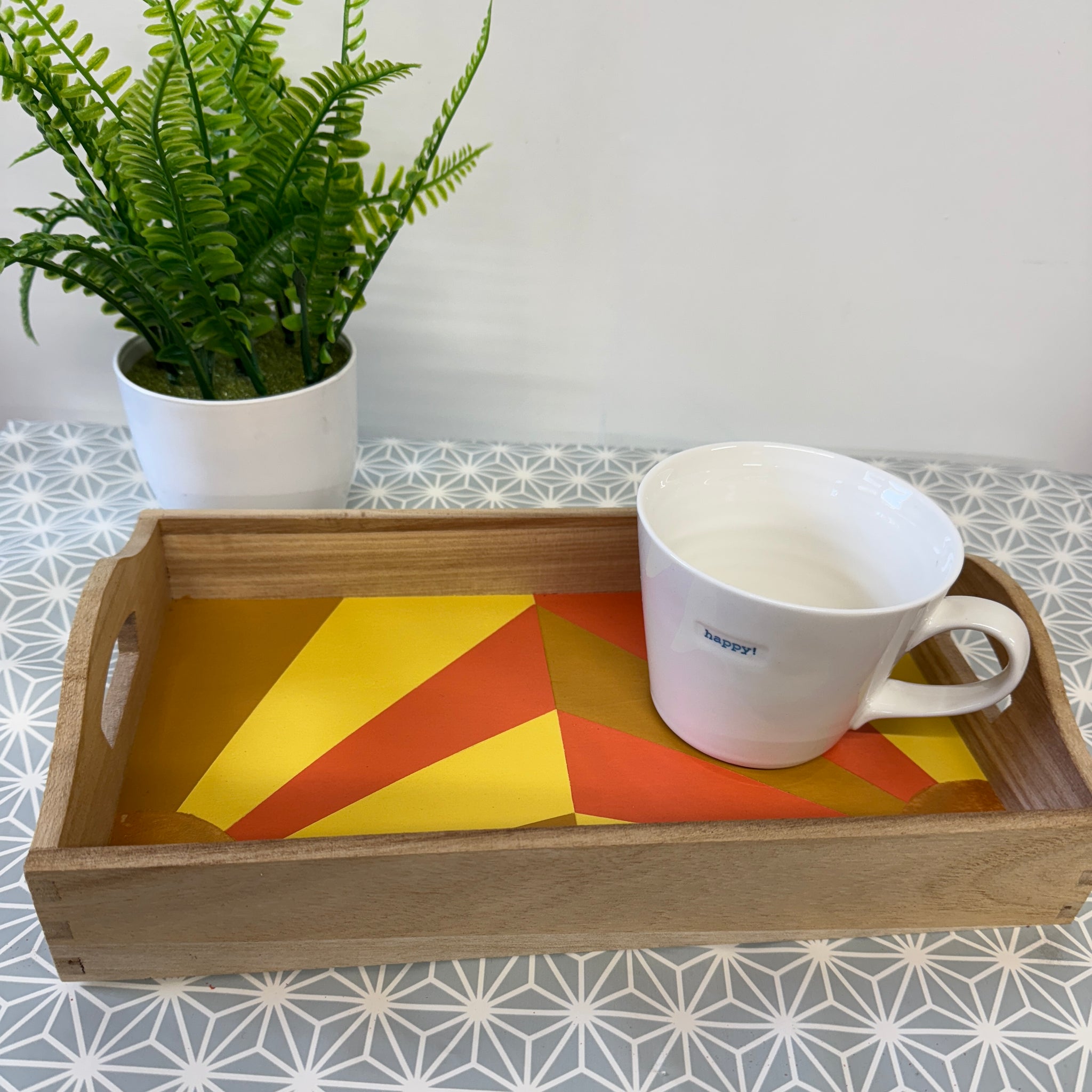You will be provided with a wooden tea tray just perfect for a couple of mugs ready for you to paint your own colourful, geometric design.