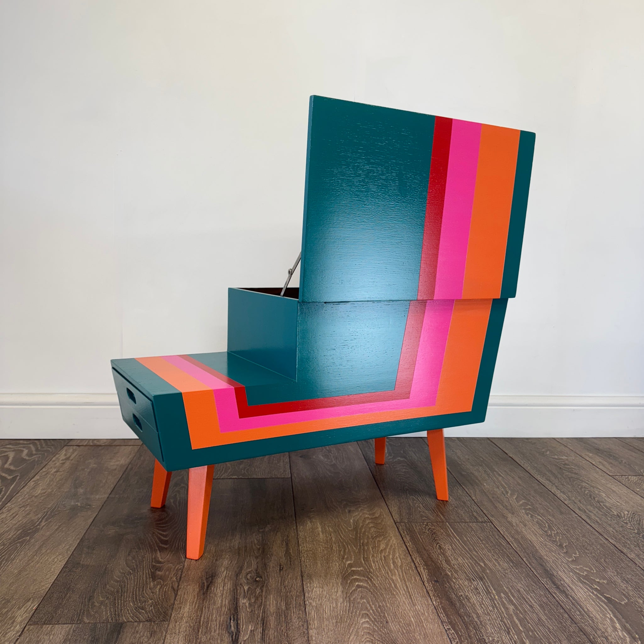 Upcycled mid-century modern furniture – a hand-painted sewing box turned bold statement piece for colourful homes.