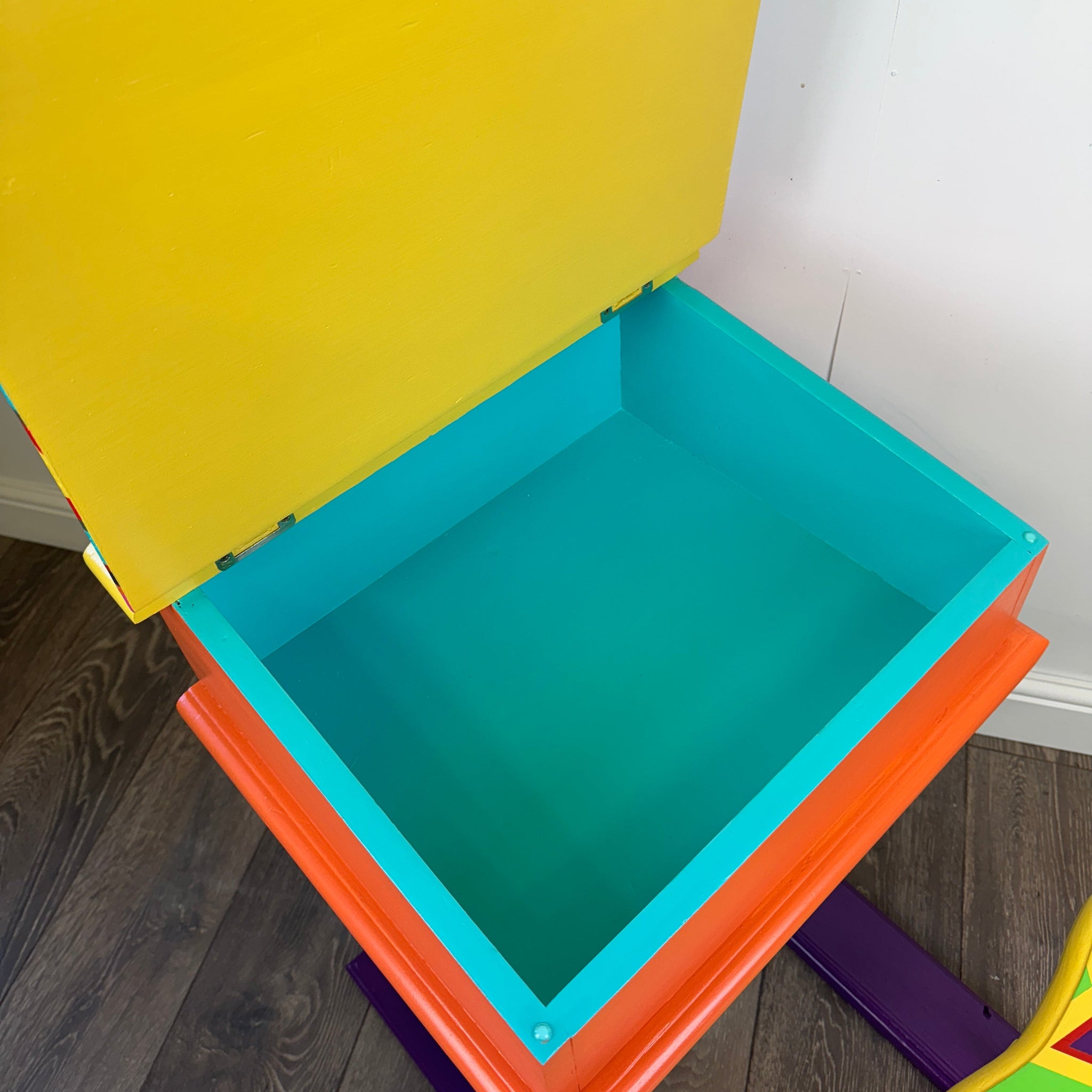 Add a burst of pure joy to your little one’s space with this one-of-a-kind, hand-painted vintage school desk! Once a humble classroom classic, this beautiful piece has been lovingly transformed into a technicolour dream that’s guaranteed to make homework time way more fun.